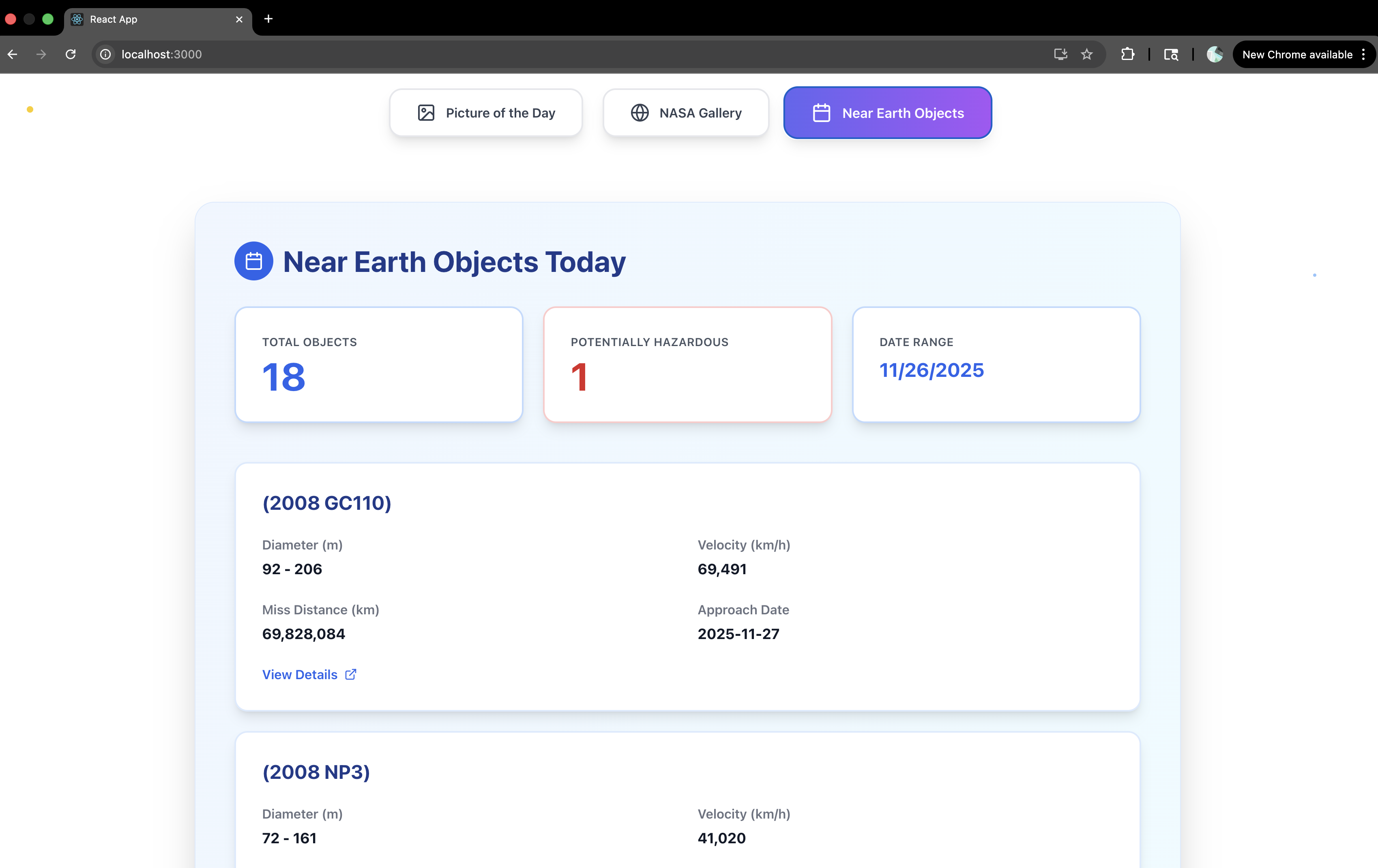 The goal of this NASA React API Dashboard project was to strengthen my understanding of fetching and handling API data while building interactive user interfaces in React. Through this project, I improved my skills in managing asynchronous data, component structure, and state management while working with real-world data from NASA’s APIs.